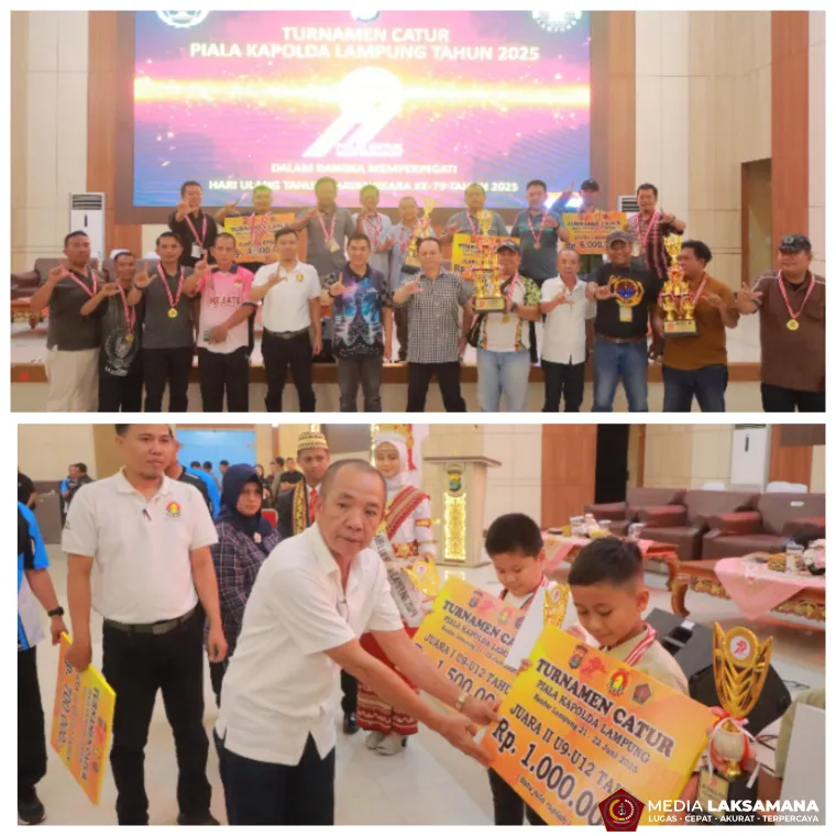 Gelaran akbar Turnamen Catur Piala Kapolda Lampung Tahun 2025 dalam rangka memperingati Hari Ulang Tahun (HUT) Bhayangkara ke-79 secara resmi ditutup hari ini di GSG Polda Lampung, Minggu (22/6/2025).