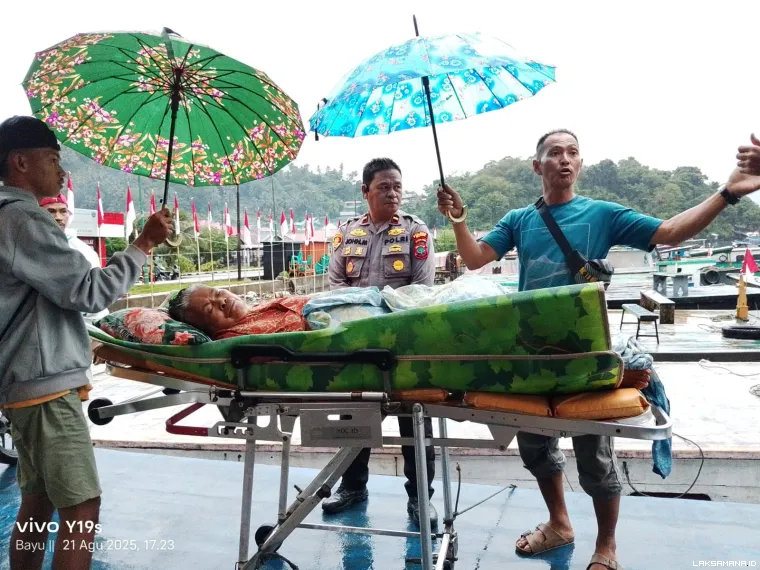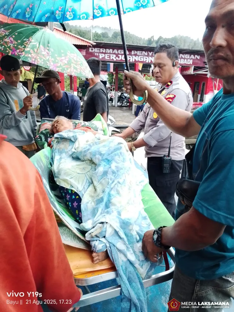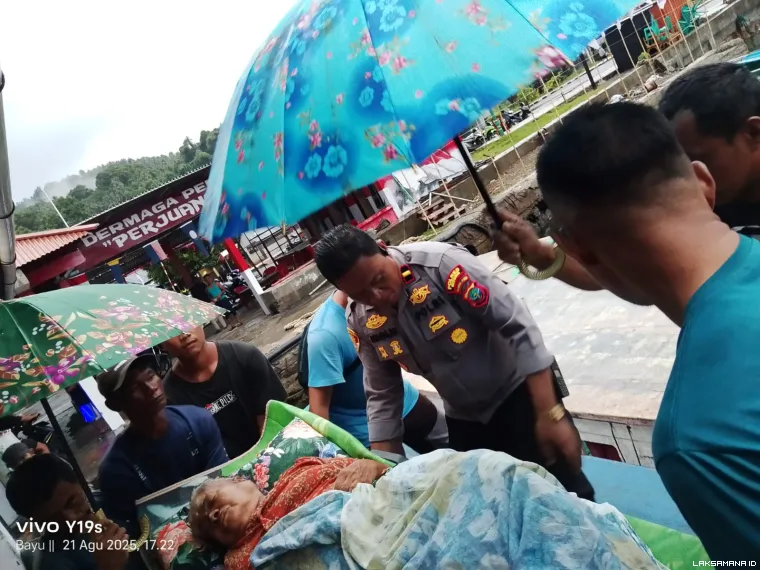 Kapolsek Lembeh Selatan, IPDA John Marisi, SH, menunjukkan aksi kemanusiaan saat membantu evakuasi seorang lansia perempuan berusia 80 tahun lebih yang sakit di Kelurahan Lirang, Kecamatan Lembeh Utara. Kamis (21/8/2025)