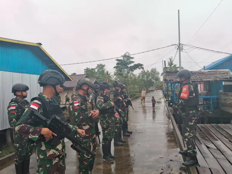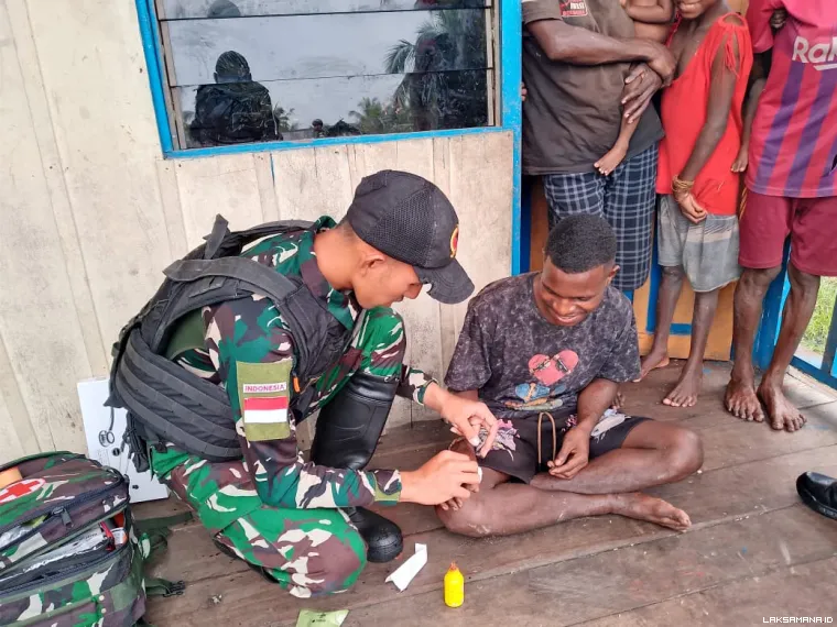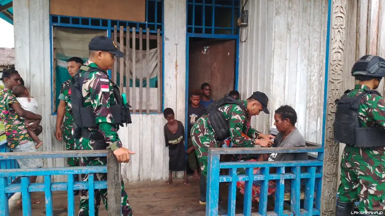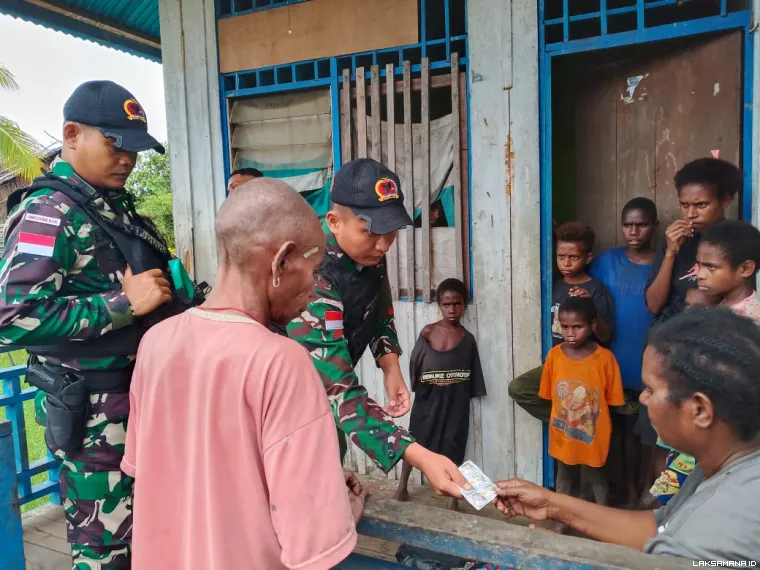 Pos Fayit Satgas Yonif 123/Rajawali melaksanakan pelayanan kesehatan langsung ke rumah-rumah warga (door to door) di kampung Basim, Distrik Fayit, Kabupaten Asmat, (30/8/2025). Kegiatan ini dilakukan untuk menjangkau masyarakat yang kesulitan datang ke fasilitas kesehatan karena jarak dan kondisi medan.