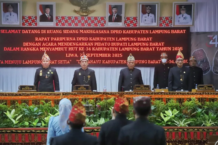 Laksamana.id | Lampung Barat - Bupati Lampung Barat Parosil Mabsus menghadiri Rapat Paripurna Istimewa DPRD setempat, dalam rangka peringatan Hari Jadi ke-34 Kabupaten Lambar tahun 2025. Acara ini berlangsung di Gedung Sidang Maghgasana, Selasa (23/9/2025)