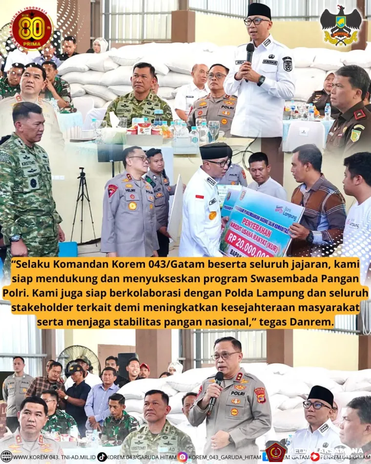 Dalam rangka mendukung program nasional menuju Swasembada Pangan, Komandan Korem 043/Gatam Brigjen TNI Haryantana, S.H., menghadiri kegiatan Tanam Raya Serentak Kuartal IV Tahun 2025 yang dilaksanakan di Gudang Ketahanan Pangan Polri, Jalan Kota Baru Purwotani, Kecamatan Jati Agung, Kabupaten Lampung Selatan, Rabu (8/10/2025).