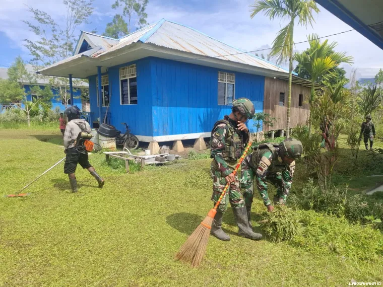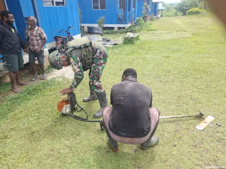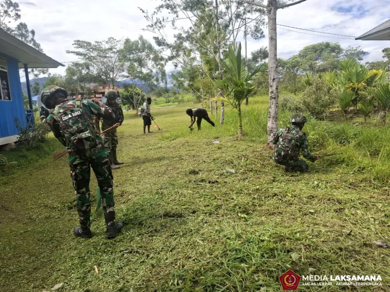 Kunjungan ini dimanfaatkan personel Satgas untuk menjalin silaturahmi sekaligus membantu Bapak Feramin membersihkan halaman rumahnya. Dengan semangat gotong royong, personel Satgas bersama warga bergandengan tangan membersihkan rumput dan merapikan lingkungan sekitar rumah agar terlihat lebih bersih dan nyaman.