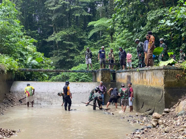 Senin (27/10/2025) 16 (enam belas) personil Satgas Pamtas RI-PNG Statis Yonif 643/Wns Dipimpin Kapten Inf Nanang yang terdiri dari 6 (enam) unsur pengamanan dan 10 (sepuluh) unsur yang terlibat langsung bahu-membahu normalisasi saluran air bersama masyarakat dan _Stakeholder_ wilayah PLBN Skouw.