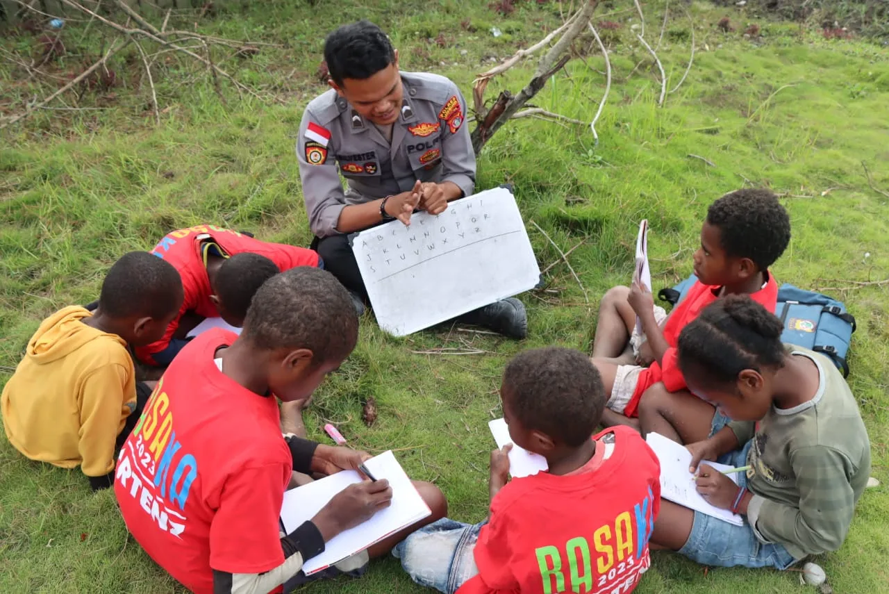Laksamana | Wamena - Satgas Binmas Ops Rasaka Cartenz Wilayah Jayawijaya menggelar Program SI-IPAR ( Polisi Pi Ajar ) dengan ajarkan Membaca dan menulis huruf abjad ditambah materi-materi lainnya seperti penjumlahan serta pengurangan pada anak-anak di Kampung Kama Distrik Wesaput, Kabupaten Jayawijaya (14/2023).Ipda Benyamin Tandipayung selaku Kasubsatgas Binmas Jayawijaya mengatakan penggelaran program SI-IPAR di Kabupaten Jayawijaya dilakukan di banyak tempat, dimana salah satunya adalah kelompok belajar anak-anak di Kampung Kama.