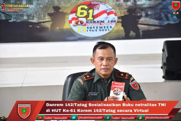 Danrem menjelaskan bahwa hari ini bertepatan dengan HUT Korem ke-61 tahun dilaksanakan sosialisasi buku netralitas TNI ini perlu dilaksanakan kepada seluruh prajurit, tujuannya agar Prajurit tetap netral, tidak memihak dan mendukung salah satu parpol caleg ataupun pasangan calon tertentu dalam pelaksanaan pemilu, sehingga pentingnya pemahaman bagi setiap prajurit khususnya para Babinsa yang bertugas di jajaran wilayah Korem 142/Tatag“Buku netralitas TNI ini dirancang khusus untuk wilayah Kodam XIV/ Hasanuddin atas inisiasi Pangdam Hasanuddin Mayjen TNI Dr. Totok Imam Santoso, S.I.P., S.Sos,. M.Tr.(Han)., untuk disampaikan kepada seluruh prajurit,” beber Brigjen TNI Deni