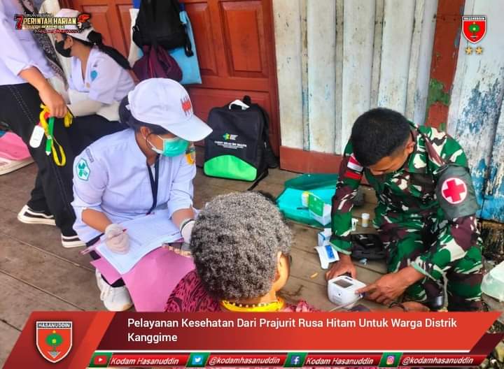 Laksamana l Tolikara -- Selain melaksanakan tugas pokok menjaga kedaulatan serta keamanan di Wilayah Papua Pegunungan, Prajurit Rusa Hitam Satgas Yonif 721/Makkasau Pos Kanggime juga memberikan pelayanan kesehatan bagi warga Distrik Kanggime, Kab. Tolikara, Papua Pegunungan, Rabu (15/11/23).Pelayanan kesehatan dilaksanakan di Kantor Distrik dengan melibatkan beberapa pihak terkait, salah satunya tenaga kesehatan dari Puskesmas Kanggime.