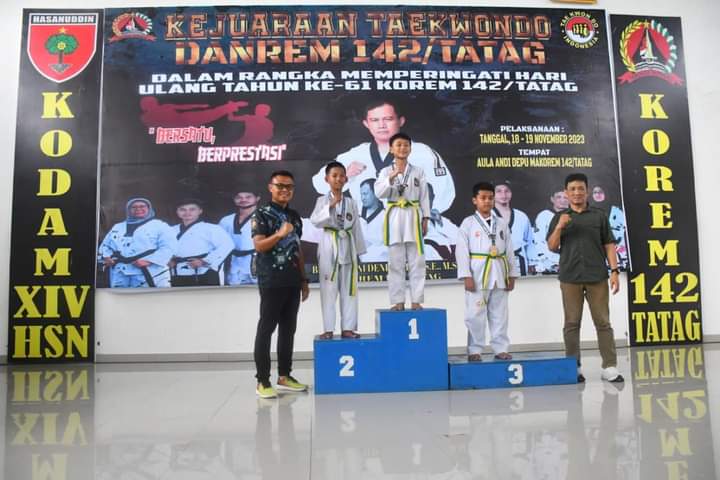 Laksamana l Mamuju – Danrem 142/Tatag Brigjen TNI Deni Rejeki, S.E., M.Si yang diwakili Kasiter Kasrem 142/Tatag Kolonel Arm Iron Prasetyo, S.Sos., M. Tr. (Han)., M.I.Pol menutup kejuaraan Taekwondo Danrem Cup 1 tahun 2023 bertempat di Aula Andi Depu Makorem 142/Tatag jalan Abdul Malik Pattana Endeng, Kel. Rangas Kec. Simboro Kab. Mamuju Prov. Sulbar. Minggu (19/11/2023)Kejuaraan yang sudah di gelar selama dua hari, mulai tanggal 18 - 19 November 2023 ini diikuti 100 peserta dari Kabupaten Mamuju, para atlet yang berkompetisi dibagai atas 4 kategori kelas yaitu Pra Cadet A,B,C dan Super Pra Cadet dgn jenis pertandingan Kyorugi yang memperebutkan medali dan sertifikat dari Danrem 142/Tatag