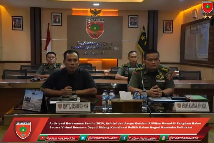 Laksamana l Makassar - Pangdam XIV/Hasanuddin, diwakili Asisten Intelijen (Asintel) Kolonel Inf Enjang, S.I.P., bersama Asisten Operasi (Asops) Kasdam XIV/Hasanuddin Kolonel Inf Josep Dat Dariyamanta S, S.E., mengikuti Rapat Koordinasi (Rakor) secara virtual dalam rangka Menjaga Stabilitas Politik, Hukum dan Keamanan pada Tahapan Pemilu 2024, bertempat di Ruang Puskodalops, Makodam, Kota Makassar. Selasa (21/11/2023).Rakor yang dipimpin langsung oleh Deputi Bidang Koordinasi Politik Dalam Negeri Kemenko Polhukam Mayjen TNI Heri Wiranto, S.E., M.M., ini bertujuan untuk menyatukan persepsi dan langkah antara pemerintah pusat atau daerah dalam mengantisipasi kerawanan pelaksanaan Pemilu 2024.