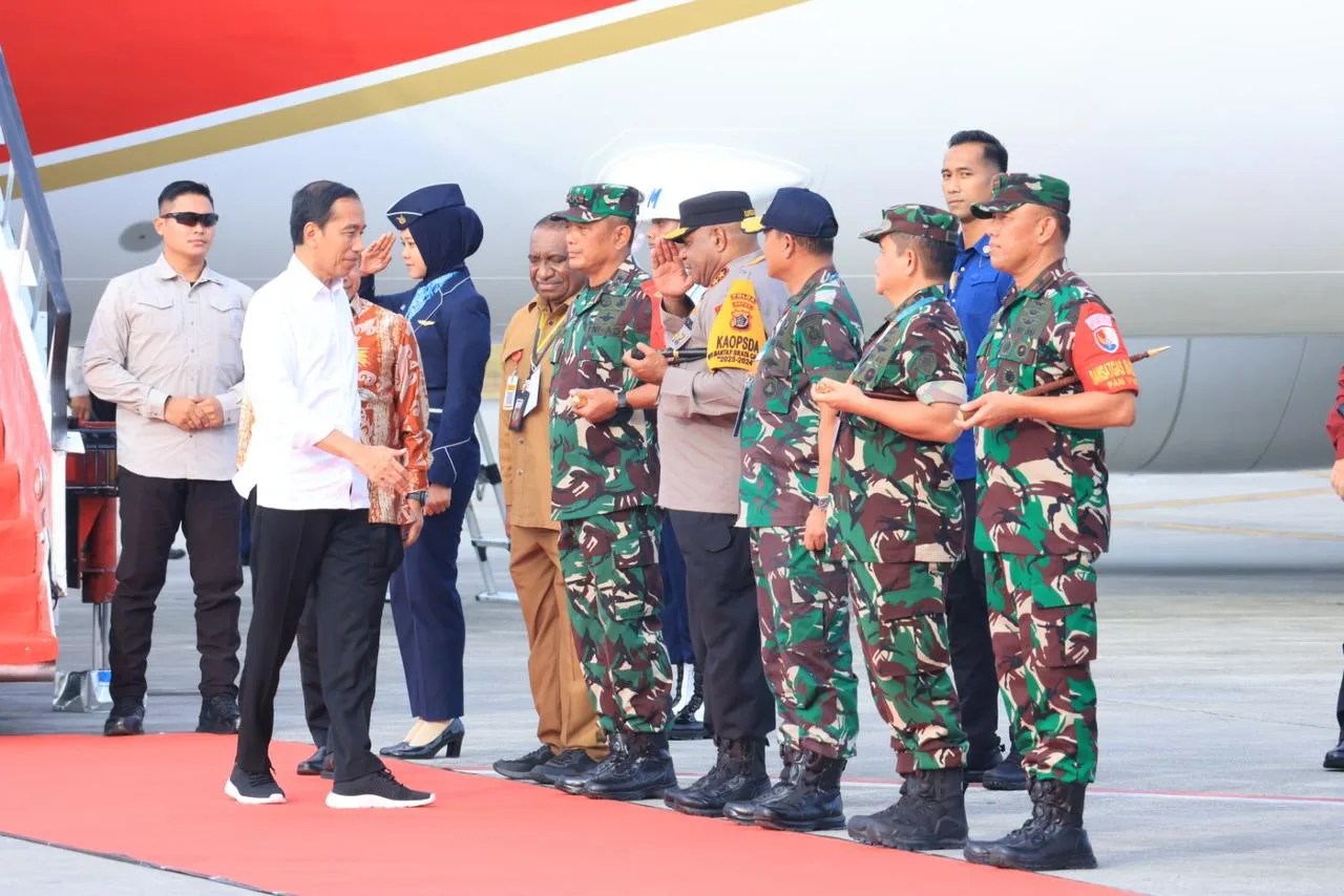 Presiden Joko Widodo dan rombongan tiba dengan menggunakan pesawat udara Kepresidenan Republik Indonesia tipe Boeing 737-800. Kedatangan ini merupakan bagian dari kunjungan kerja di wilayah Kabupaten Biak Numfor, terkait kegiatan Sail Teluk Cenderawasih (STC) TA. 2023.Kapolda Papua, Irjen Pol. Mathius D. Fakhiri, S.I.K, menyampaikan rasa hormatnya dengan kesiapan aparat kepolisian dalam menyambut kunjungan kerja Presiden.