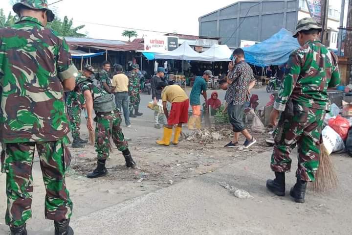Fasilitas Umum lainnya juga kita sasar termasuk rumah ibadah dan juga daerah aliran sungai untuk memastikan air mengalir dengan baik dan lancar.Harapannya dengan lingkungan yang bersih dan sehat tentunya dapat memberikan rasa nyaman bagi para pengunjung pasar dan juga para pedagang.Ini juga bisa mencegah penyebaran wabah penyakit jika lingkungan bersih. Tandasnya.Sementara Mansur salah satu petugas kebersihan pasar menyambut gembira dengan kehadiran para bapak tentara membantu membersihkan lingkungan pasar.