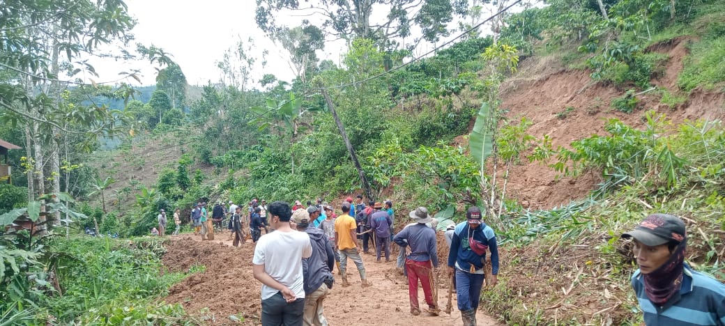 Dan nampak hadir babin kantipnas ,dan beberapa aparat pekon setempat.Terlihat jelas ruas jalan cor,coran yg longsor menggantung di beberapa titik. sampai sampai saat ini penangangan di lakukan secara bergotong royong oleh masyrakat setempat, agar jalan dapat di gunakan kembali sperti sedia kala.