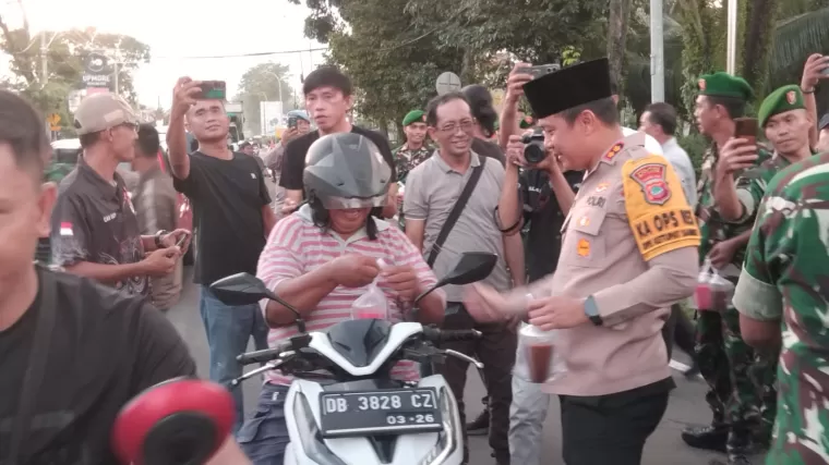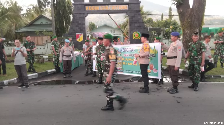 Puluhan Personil TNI Polri Kota Bitung bersama sama membagikan Takzil kepada masyarakat yang melewati Makodim Bitung, pembagian Takzil dipimpin Dandim 1310 Bitung Letkol Czi Hanif Tupen, ST, MIP dan Kapolres Bitung AKBP ALBERT ZAI.,SIK.,MH.Terlihat suasana keakraban dan kekeluargaan terpancar saat momen berbagi Takzil kepada sesama masyarakat yang akan berbuka puasa melewati jalan raya depan Makodim.
